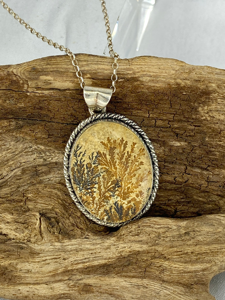 This stunning pendant is a Psilomelane Dendrite set in 925 sterling silver.