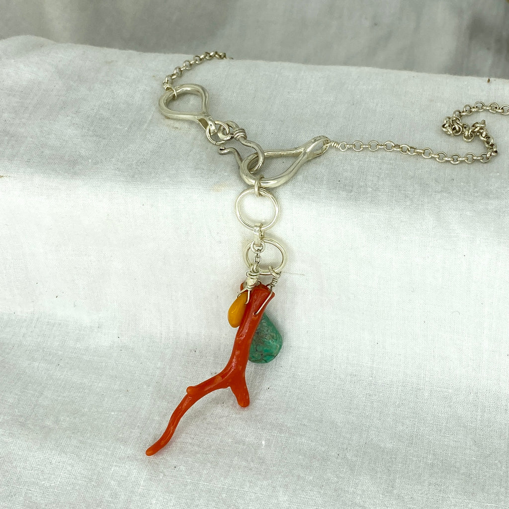 An elegant statement necklace, one of a kind. Handmade with Red Coral, Amber & Turquoise on Sterling silver chain.