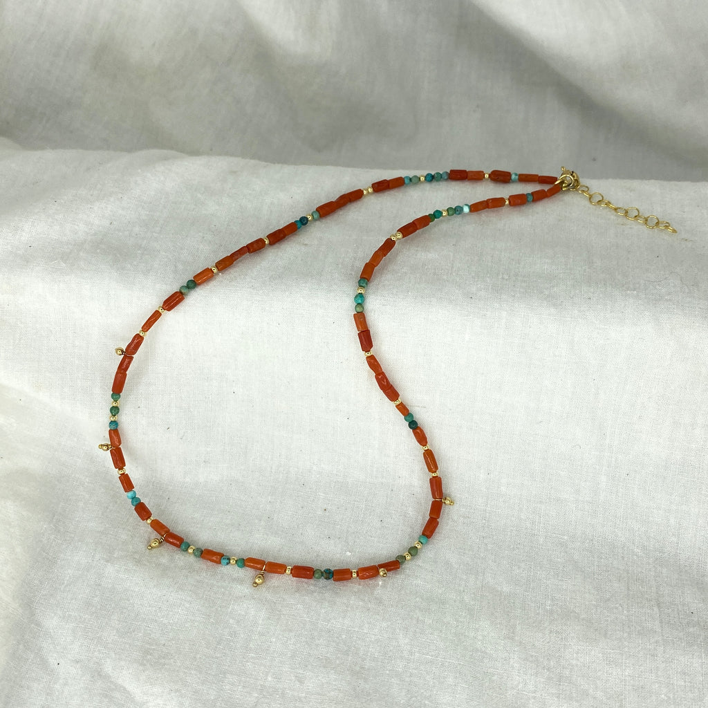 Natural Red Coral necklace featuring Turquoise & 14k gold filled adornments throughout.