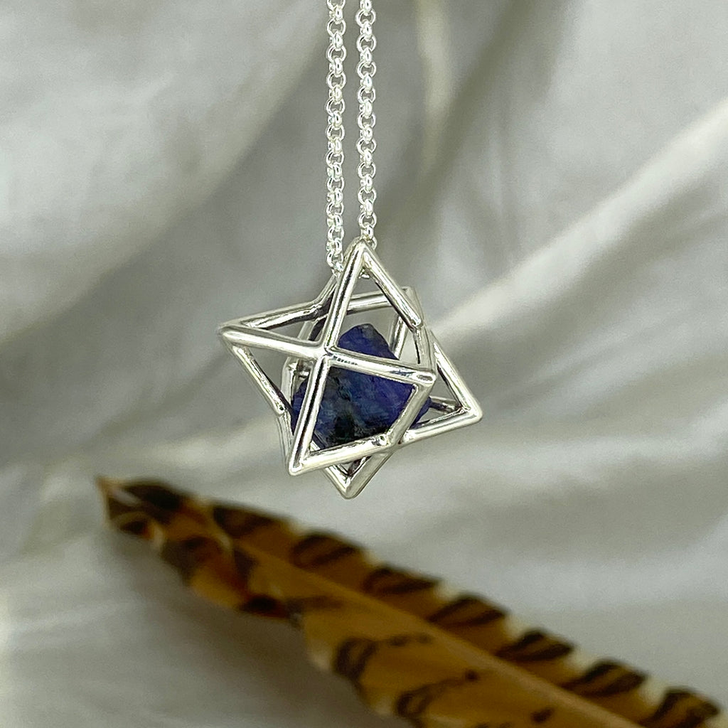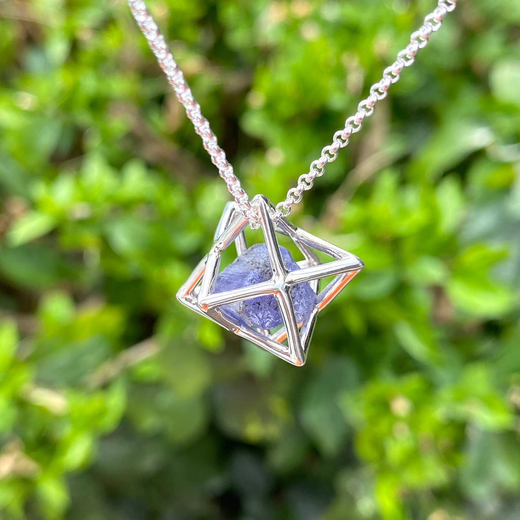 This stunning necklace has a raw piece of Tanzanite inside a sterling silver Merkaba star. Silver chain is included and has 5 optional lengths to fasten from 45cm to 55cm.