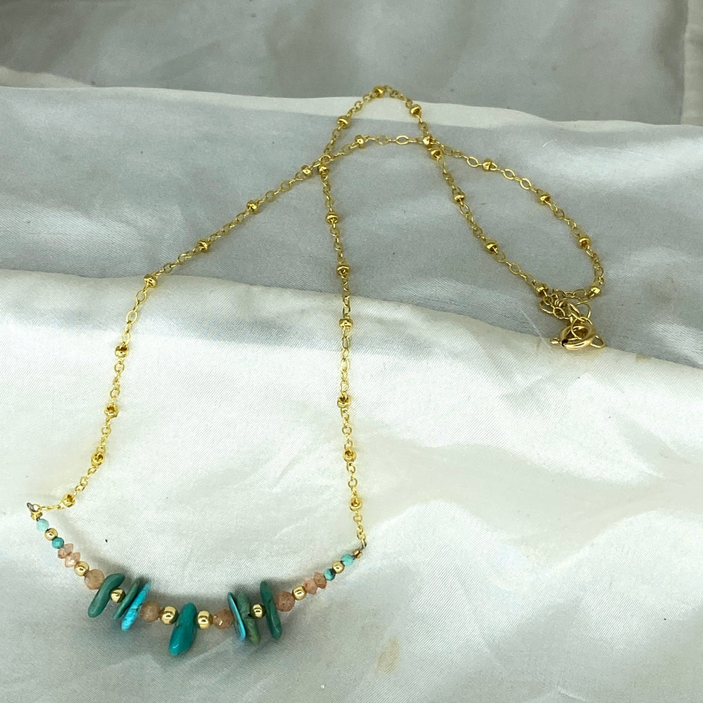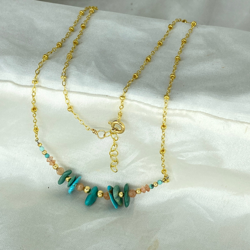 Stunning 14kgf necklace featuring Turquoise and Sunstone on a chain with decorative gold to stand out anywhere you go.