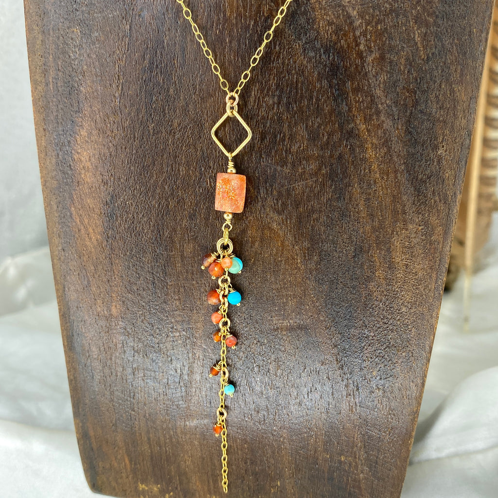 Beautiful gold filled necklace featuring a centre decorative drop consisting of Sunstone & Turquoise delicately handcrafted onto 14kgf chain.