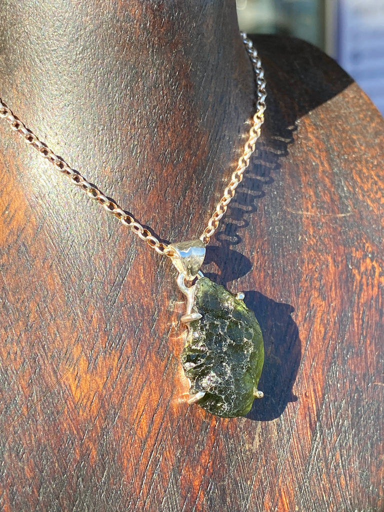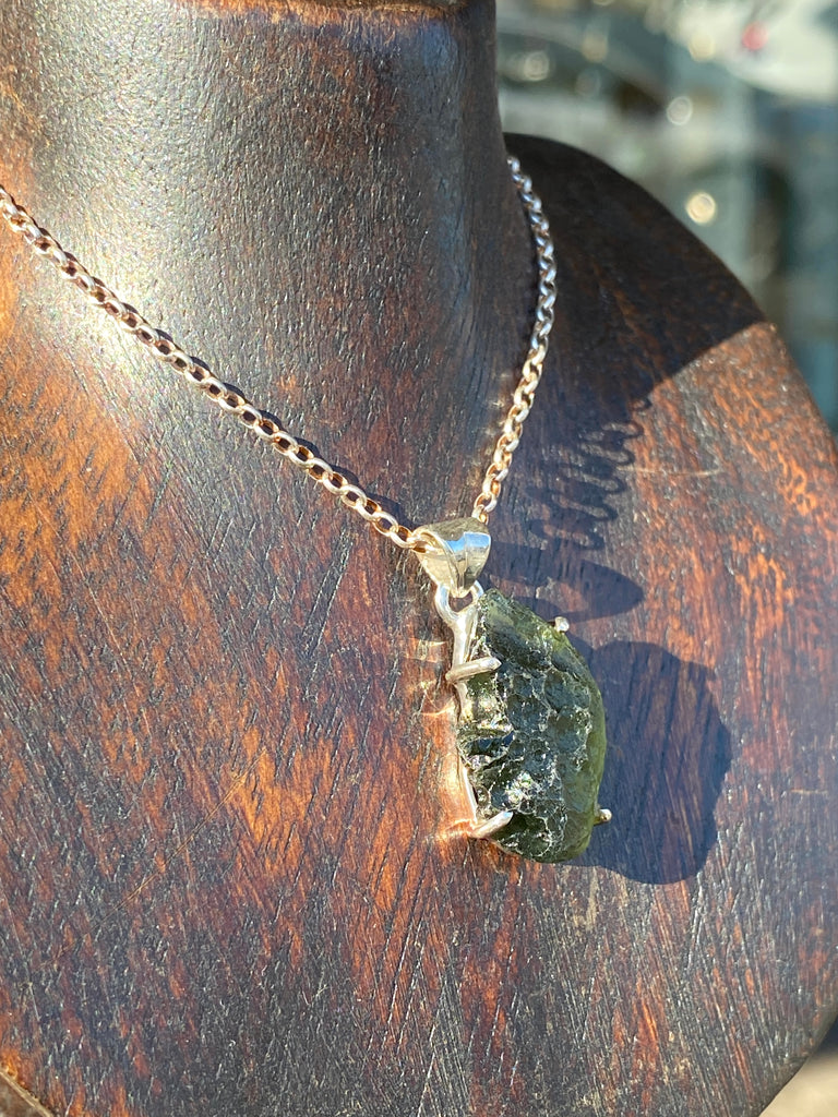 Natural Moldavite Pendant set in 925 sterling silver claw grip.