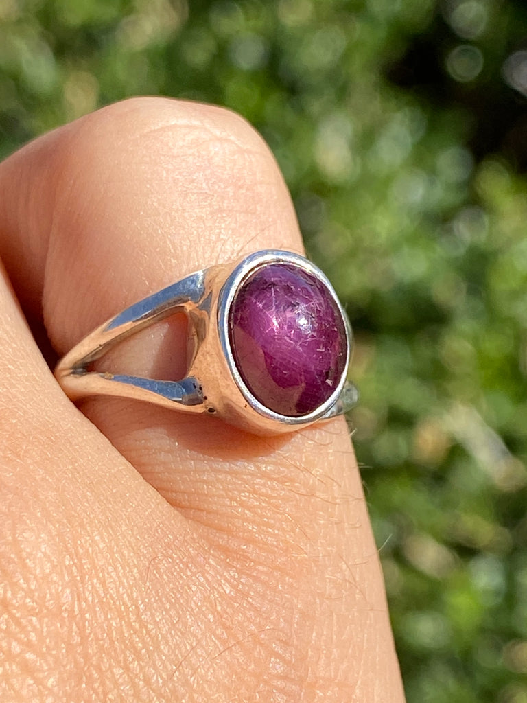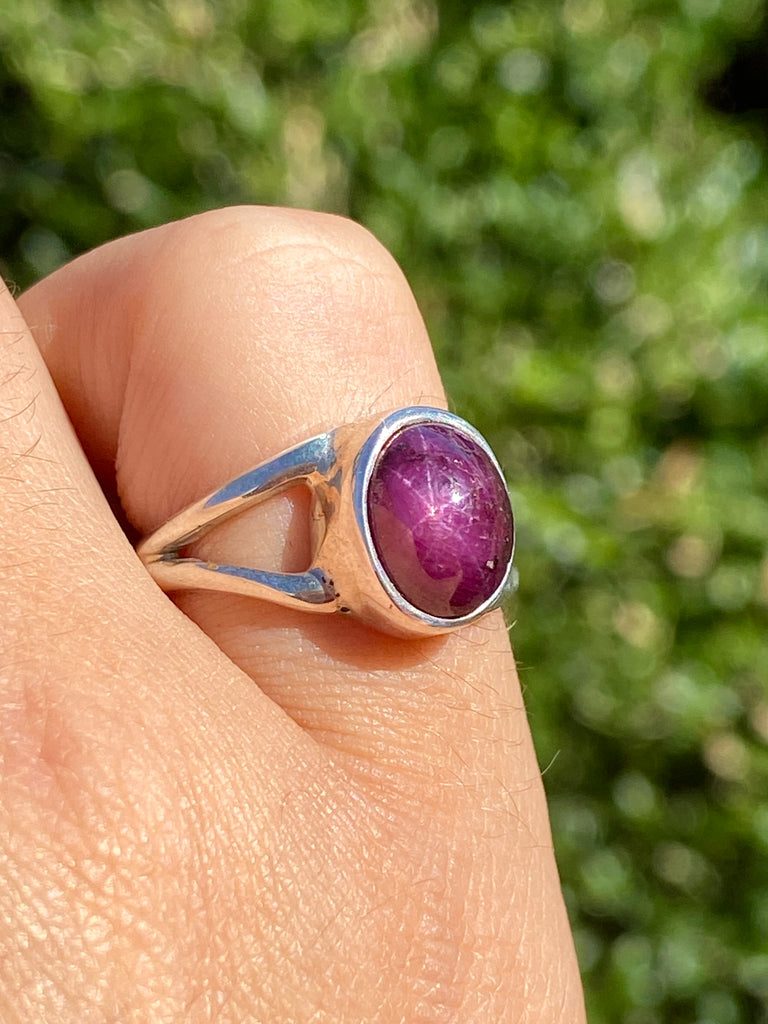 This Star Ruby ring is set in 925 sterling silver with a split band smooth finish.