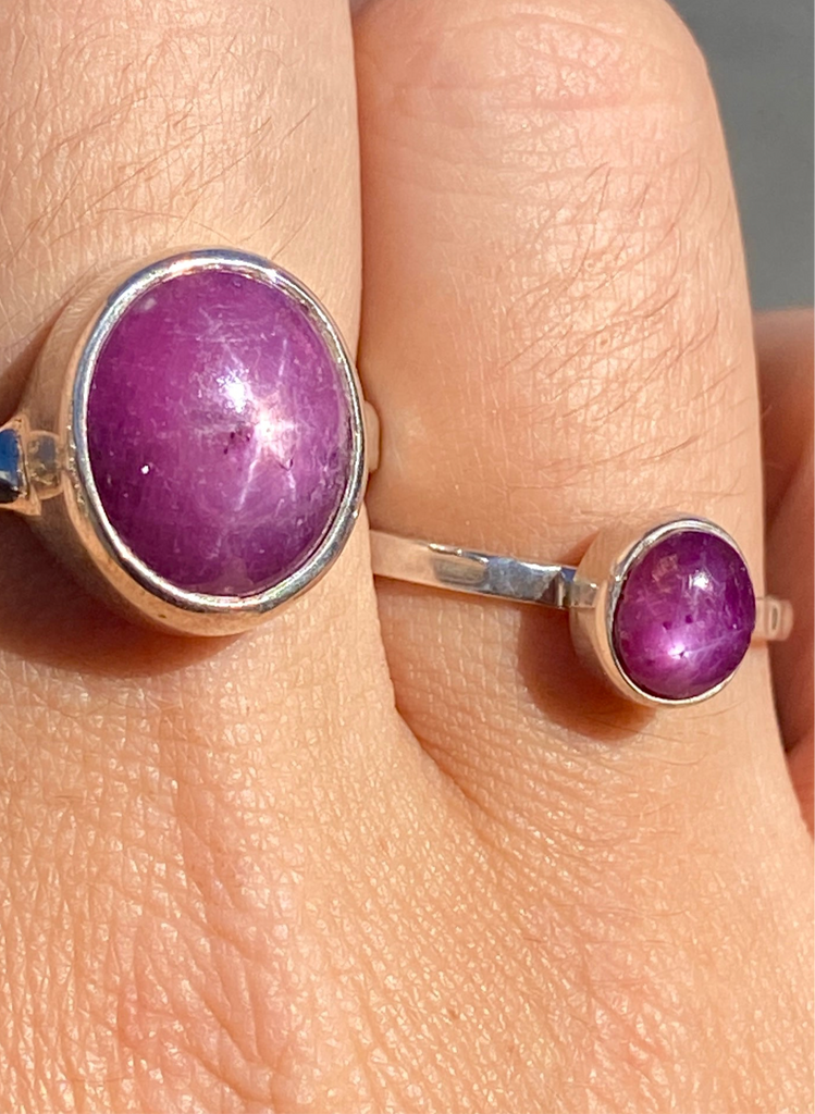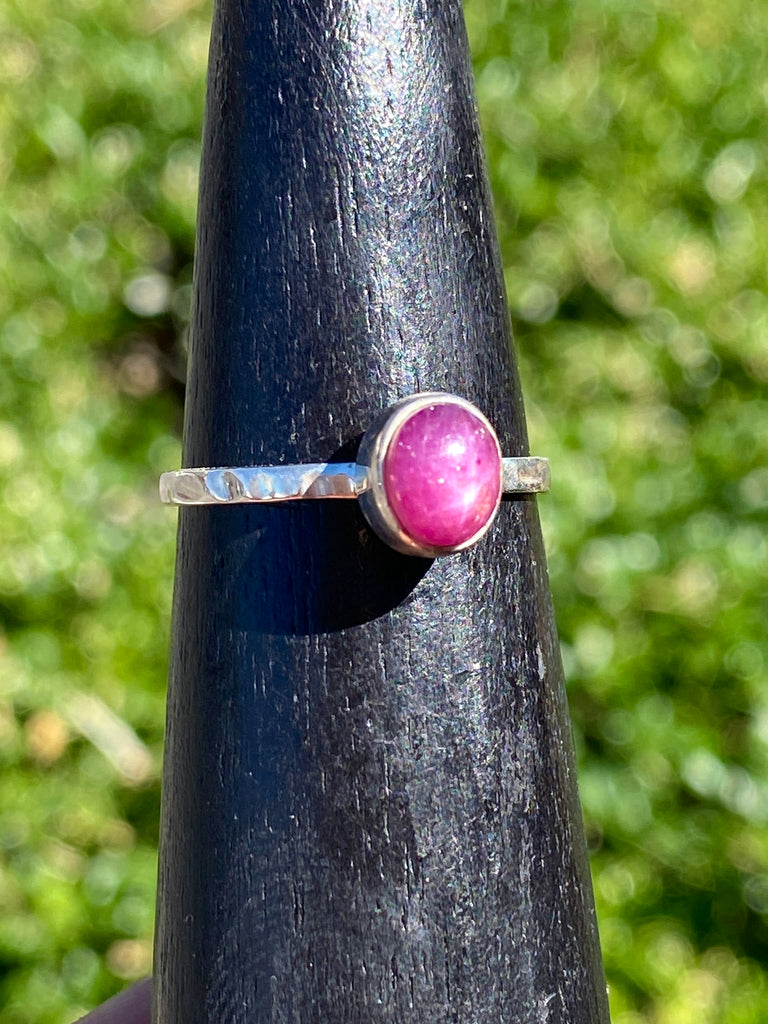 This Star Ruby ring is set in 925 sterling silver with a softly hammered finish on the band.