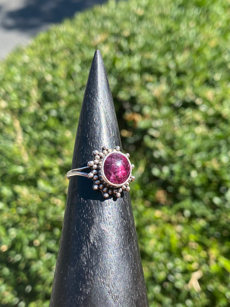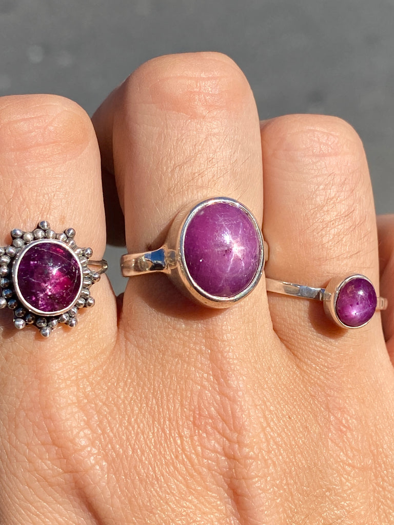 This Star Ruby ring is set in 925 sterling silver with a smooth finish on the band & adornments around the Ruby to create a flower look.