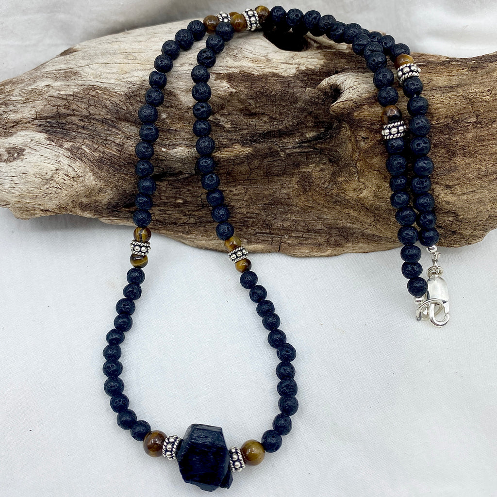 - Natural Tourmaline nestled between black Lava with accents of Tigers eye & pops of Sterling Silver 925